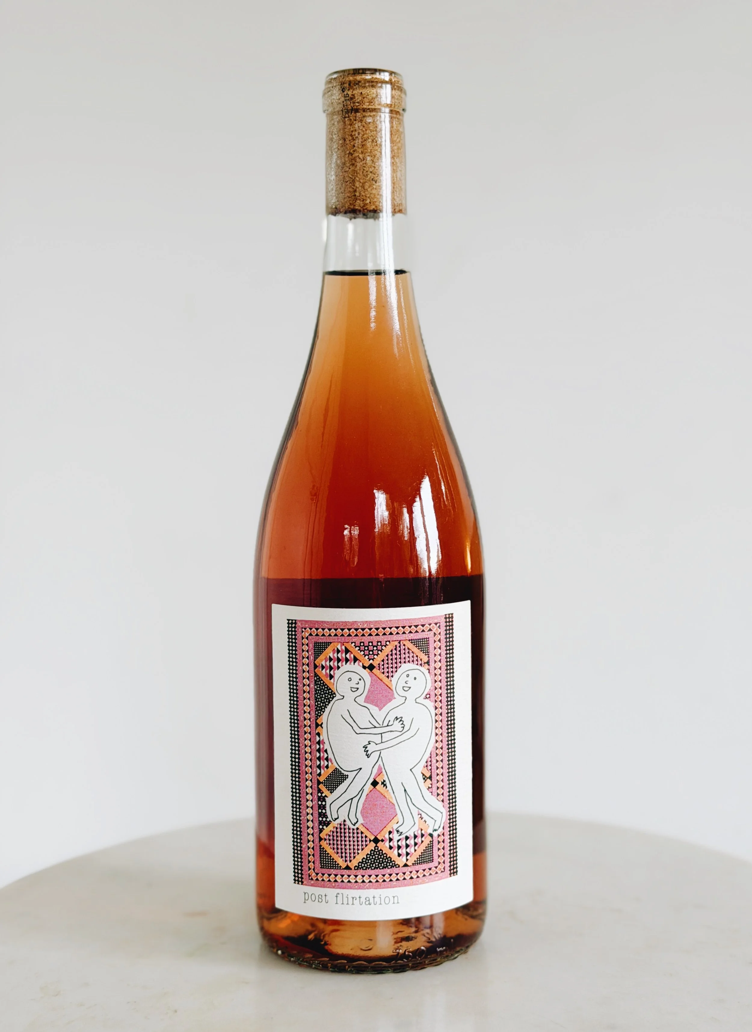 This Post Flirtation Rosé NV No. 4 is a blend of 75% Nero d’Avola and 25% Vermentino from organic vineyards in Redwood Valley, CA. Notes of red fruits, salted watermelon, cucmber and red clay. Dry and crisp yet well rounded and smooth.